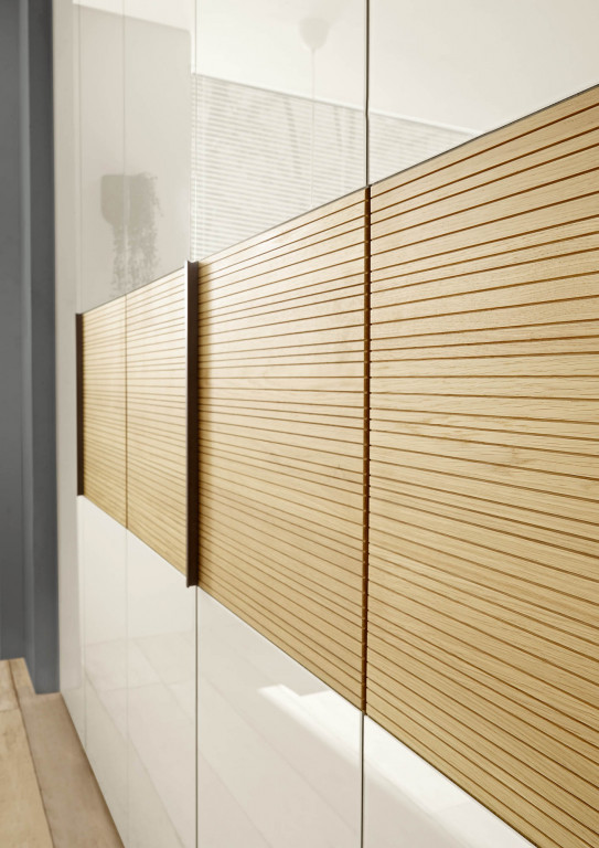 Front Glas champagner, Mitteltüren mit Querriegel, massiv mit Rillenstruktur - Drehtürenschrank, 6-türig, BHT ca. 300/216/58 cm