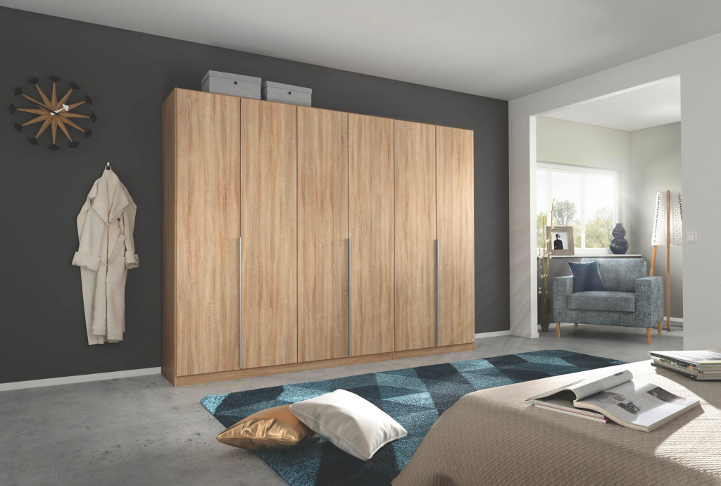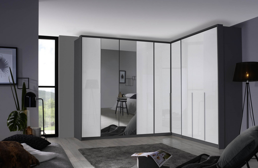 alpinweiss, Griffe alufarbig, 4 Holz- u. 2 Spiegeltüren, inkl. Inneneinteilung: Schubkasteneinsatz und Wäscheeinteilung, BHT ca. 271 x 229 x 54 cm