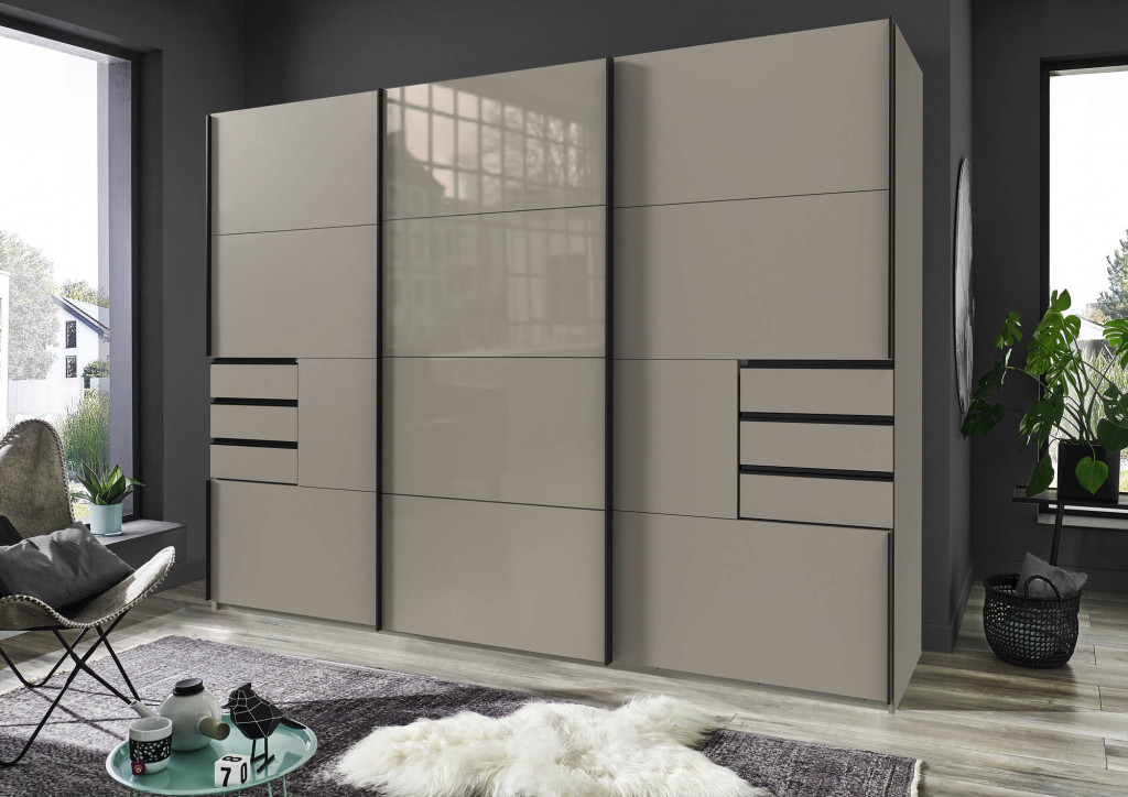 Schwebetürenschrank in -E60 Graphit, durchgängige Türfront Glas Schwarz, Schubkasten Graphit, BHT ca. 225/210/64cm