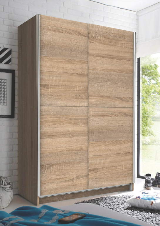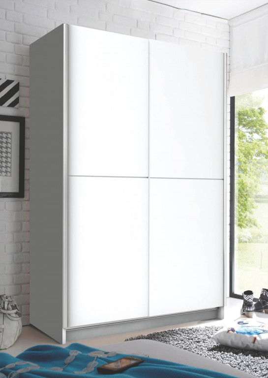 Schwebetürenschrank 2-trg. mit Spiegel in -17 Weiß , BHT 125x195,5x38cm, Inneneinteilung: 1 Mittelseite/links 5 Böden, rechts 1 Boden/1 Garderobenauszug