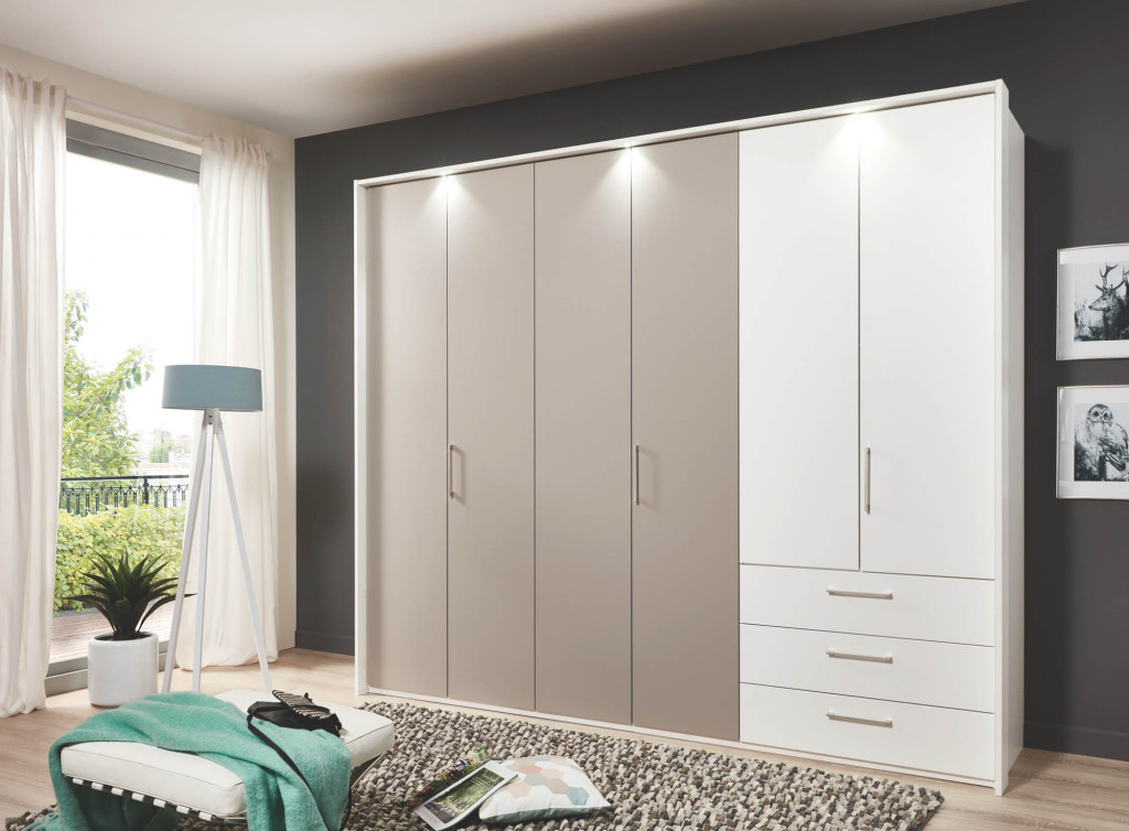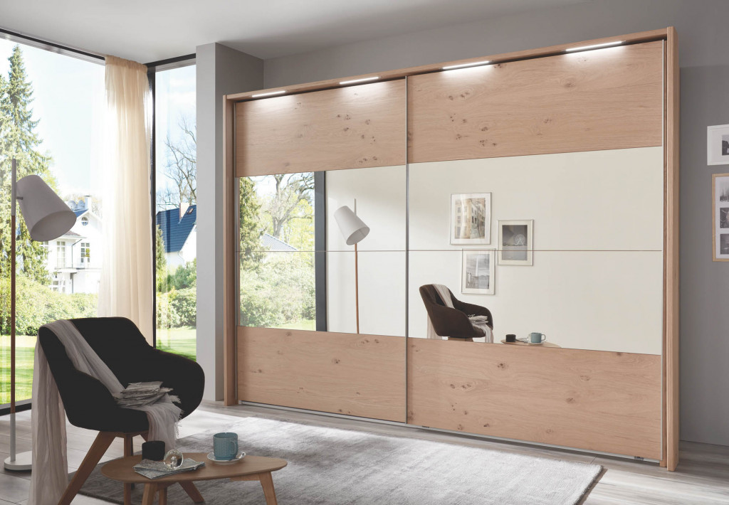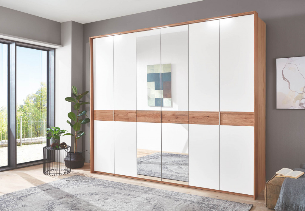Front mit Bauchbinde, Front Lack weiß, Bauchbinde Wildeiche Riffelholz, Korpus Wildeiche (PG2), Griff N1 nickelfarbig, bestehend aus: 913008 - Schwebetürenschrank, 2-türig, Aufteilung 90/60/60/90 cm, inklusive Schließdämpfer, BHT ca. 301/230,2/68 cm 903009 - Kranzleiste, 19mm, 300 cm Breit 96003 - Wechsel zu echtholzfurnierten Griffleisten