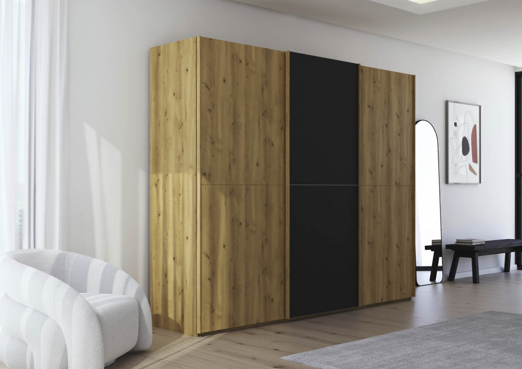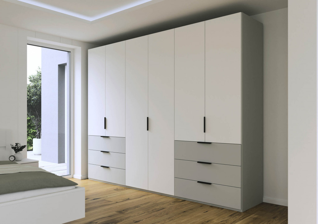 Gestalten Sie Ihren Schwebetürenschrank ganz nach Ihren Wünschen. Wählen Sie aus verschiedenen Front- und Korpus-Ausführungen, um Ihrem Raum eine persönliche Note zu verleihen. Auch die Griffleisten können Sie in unterschiedlichen Designs anpassen, um den perfekten Akzent zu setzen. Mit den wählbaren Breiten passt sich der Schrank ideal an Ihren Raum an und bietet dabei großzügigen Stauraum. Ein Möbelstück, das sich durch Individualität und zeitlose Eleganz auszeichnet.