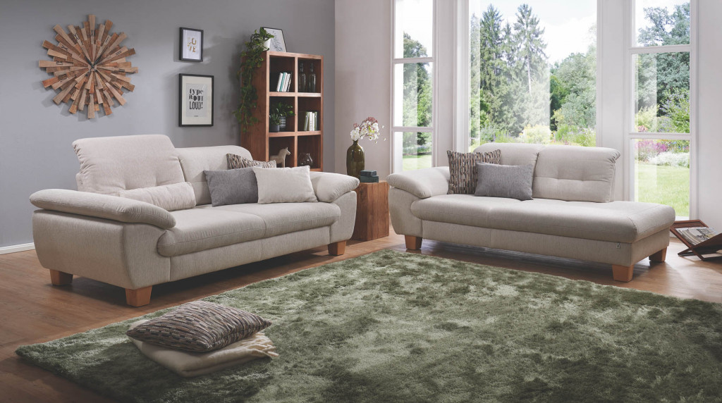 Stoff Deluxe, Farbe ziegel, Sitzqualität Soft, Rücken R2 mit Einzug, Sitzfläche S1 glatt, Armteil 1, Holzfuß 3.14 Buche, Sitzhöhe 46 cm, Sitztiefe 56-75 cm, bestehend aus: 12205 - Sofa 2-sitzig, 2 Armteile. 2x Sitztiefenverstellung inklusive, ohne Kopfteilverstellung, BHT ca. 225/85/110 cm 70224 - Einzelottomane, 1 Armteil rechts, 2x Sitztiefenverstellung inklusive, ohne Kopfteilverstellung, BHT ca. 110/85/200 cm