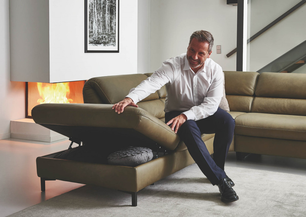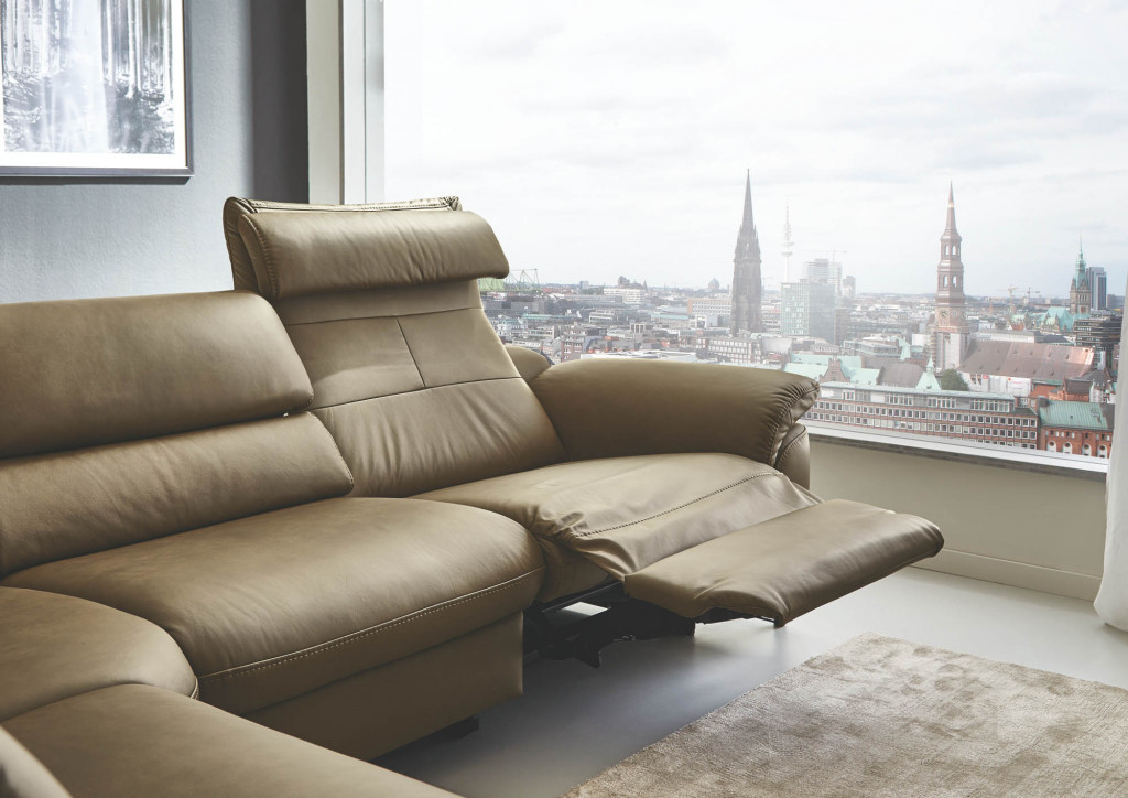 Leder Torro (PG 56), Farbe moos, Sitz F2 mittel, Rücken unecht, Metallfuß pulverbeschichtet schwarz, Sitzhöhe 45 cm, Sitztiefe 52-59 cm, bestehend aus: AhoL1,5KV - 1,5-Sitzer, Anstellhocker links, inklusive Kopfpolsterverstellung (Hochlehnkomfort und mehr Sitztiefe), BHT ca. 144/82-107/96 cm REKV - Rundecke, inklusive Kopfpolsterverstellung (Hochlehnkomfort und mehr Sitztiefe), BHT ca. 102/82-107/102 cm 2,5RKV - 2,5-Sitzer, Armteil rechts, inklusive Kopfpolsterverstellung (Hochlehnkomfort und mehr Sitztiefe), BHT ca. 178/82-107/96 cm Stellmass ca. 246 x 280 cm