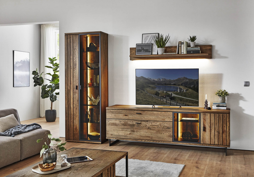 Front Eiche Cognac Lamelle massiv, Korpus außen Eiche Cognac furniert, Rahmen schwarz matt pulverbeschichtet, Glas Schwarzglas, Schubkästen mit Selbsteinzug und Dämpfung, Kombi bestehend aus: