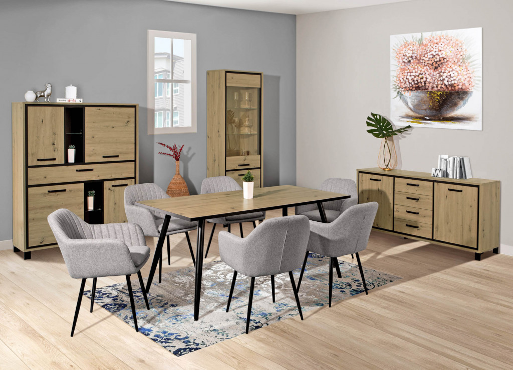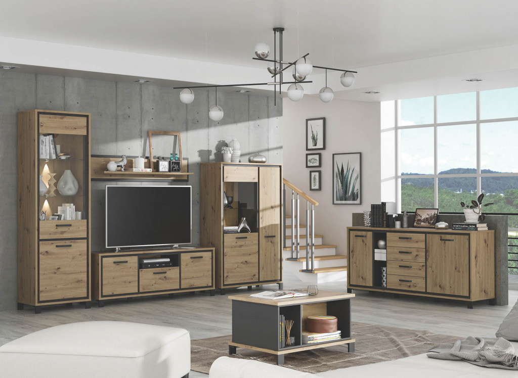 Korpus-Dekor Artisan Eiche/Schwarz Frontdekor Artisan Eiche, Griff Metall, 4 Türen/2 Glastüren/1 Schubkasten, max. Bildschirmdiagonale 77 Zoll, BHT ca. 344,2/208/41,5 cmEigenschaften: