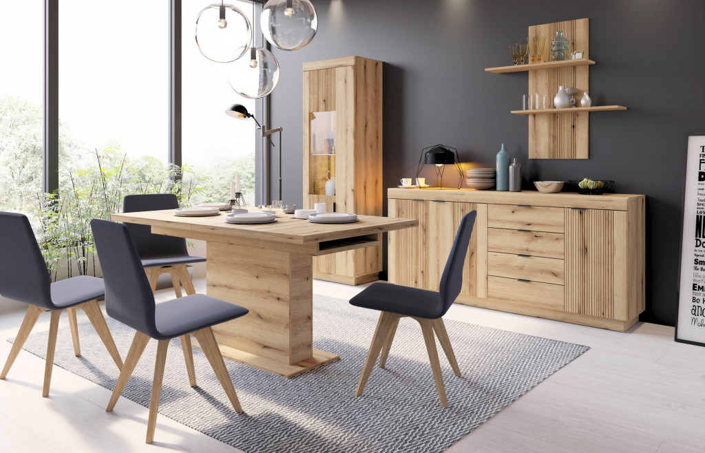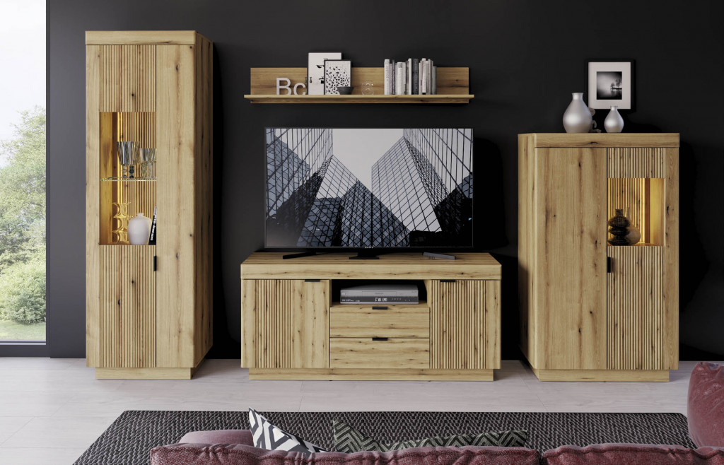 Front/Korpus PVC Eiche Coast Evoke Nachbildung, Softclose, Metallgriff, Kunststoffgleiter, inklusive Beleuchtung, bestehend aus -V01 Vitrine BHT ca. 62x197x40cm, -V02R Vitrine BHT ca. 80x140x40cm, -F02 Lowboard BHT ca. 186x67x40cm, und P02 Paneel BHT ca. 135x22x22cm