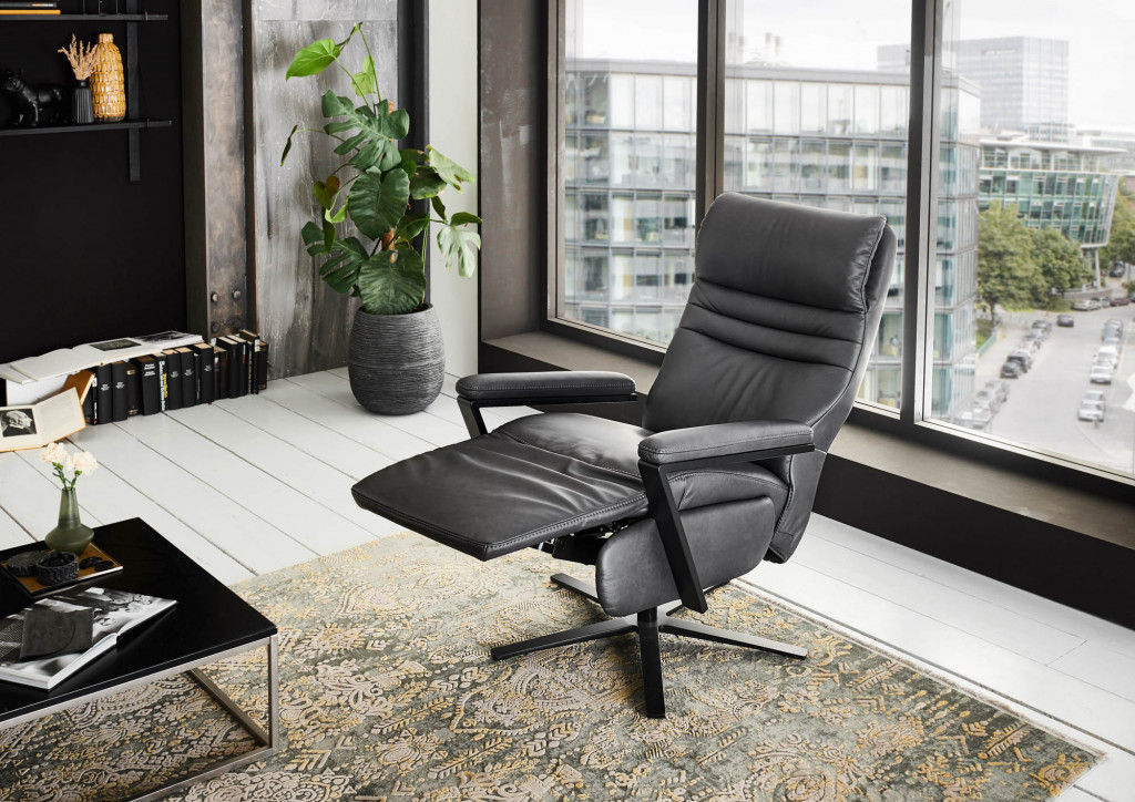 Leder LongLife Evita, Farbe honey, Metall-Armteil schwarz matt, verstellbare Armteilauflage 0217 (MP), Drehteller DT 6 Sternfuss schwarz matt, Sitzhöhe 49 cm, Sitztiefe 53 cm 1222 - Funktionssessel manuell mit Gasdruck, Ergonomie M2, BHT ca. 70/115/85 cm, Liegelänge ca. 171 cm