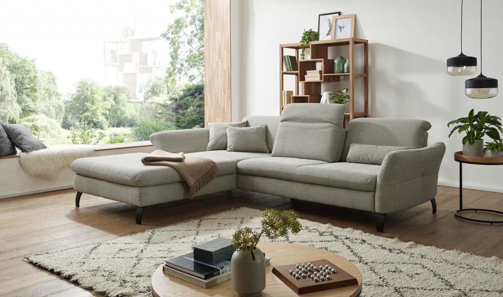 Stoff Chrono, Farbe silber, Rücken echt, Armteil klappbar inklusive, Sitzqualität soft, Metallfuß 4.28 schwarz matt, Sitzhöhe 44 cm, Sitztiefe 56-75 cm, bestehend aus: 70102 - Longchair groß, Armteil links klappbar, Kopfteilverstellung inklusive, BHT ca. 125/81/225 cm 02111 - Sofa 2-sitzig, Armteil rechts, 2x Sitztiefenverstellung inklusive, 2x Kopfteilverstellung inklusive, BHT ca. 185/81/115 cm