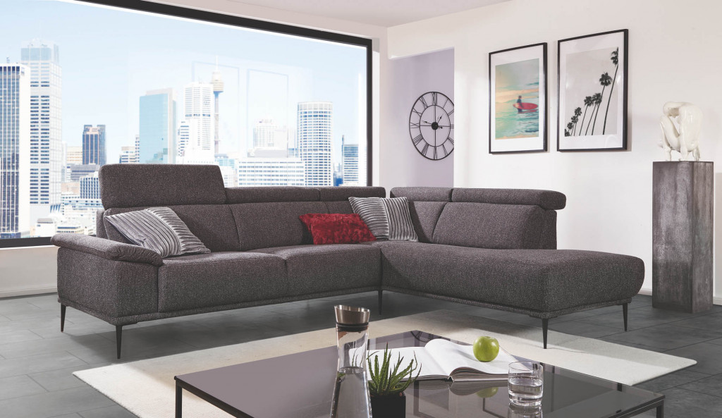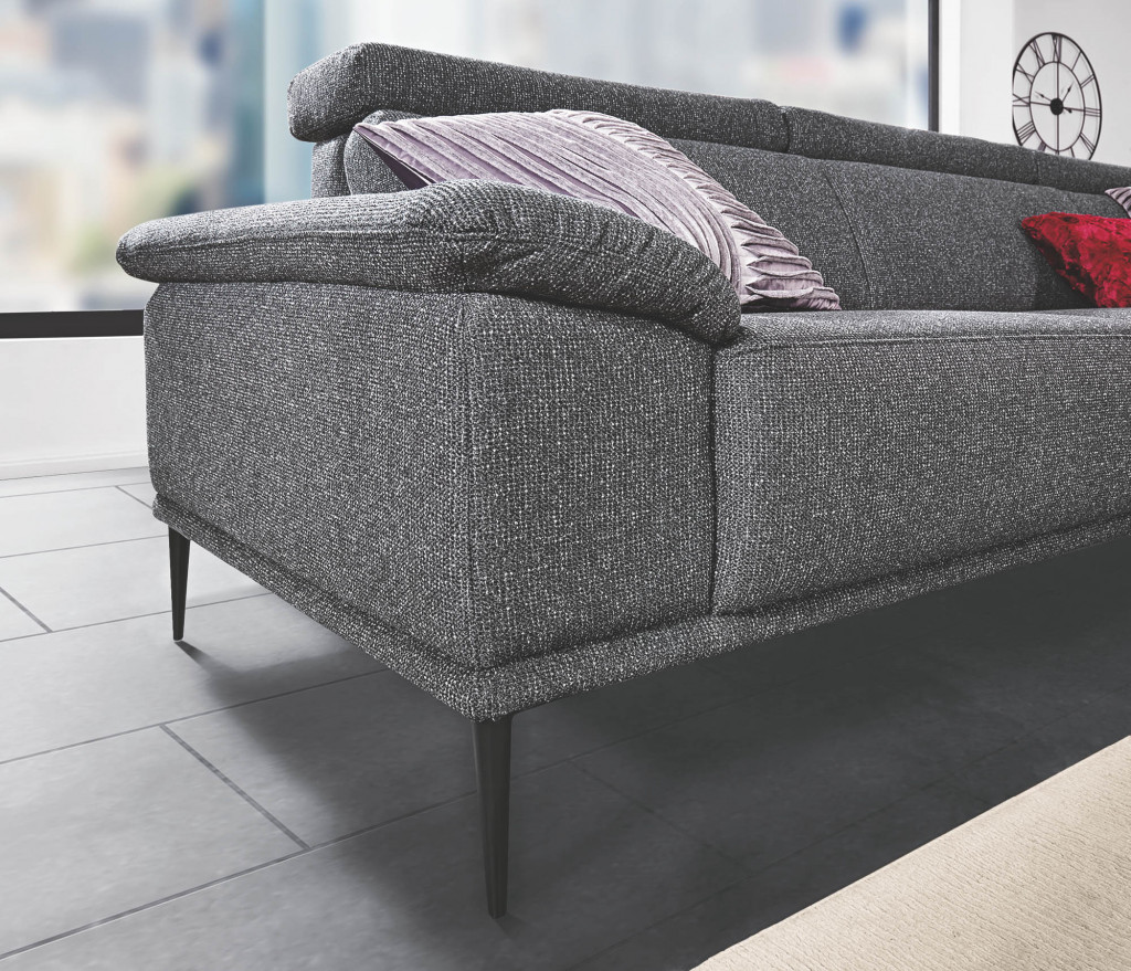 Stoff Sneak, Farbe anthrazit, Rücken echt, Sitzqualität Soft, Metallfuß 4.37 silber glänzend, Sitzhöhe 47 cm, Sitztiefe 54 cm, bestehend aus: 02110 - Element 2-sitzig, Armteil links, ohne Kopfteilverstellung, BHT ca. 175/77/95 cm 70185 - Anbausofa groß, ohne Kopfteilverstellung, BHT ca. 95/77/220 cm Stellmaß ca. 270x220 cm