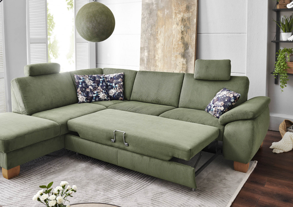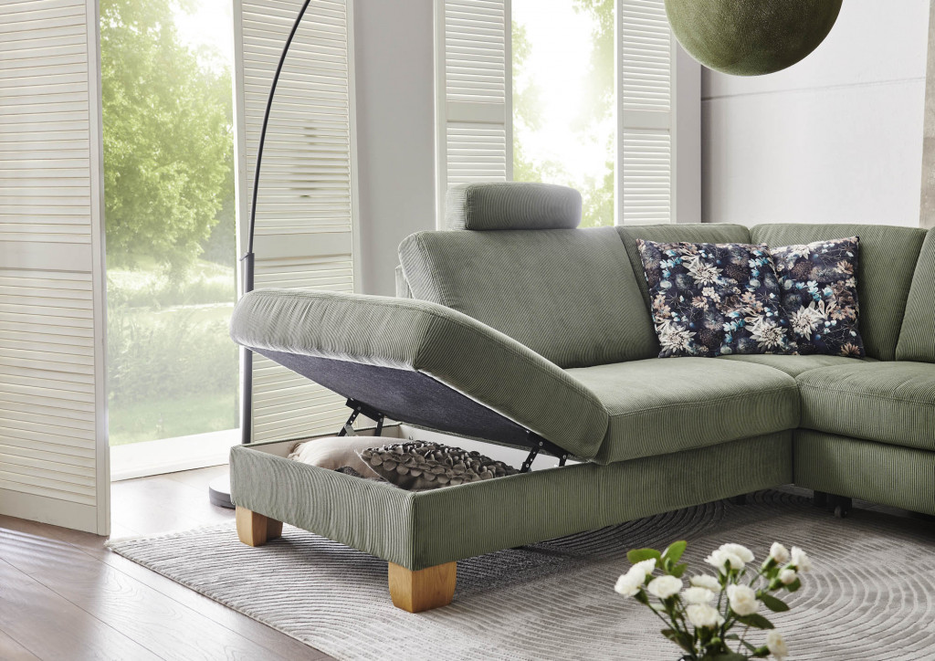 Stoff Feincord, Farbe forest, Sitz Federkern, Rücken echt, Fuß Holzfuß Wildeiche, Naht Doppelstepp mit Kontrastfaden, bestehend aus:1,5-Kombielement Hocker links, 3-Sitzer Armlehne rechts, Stellmaß ca. 236x281 cm