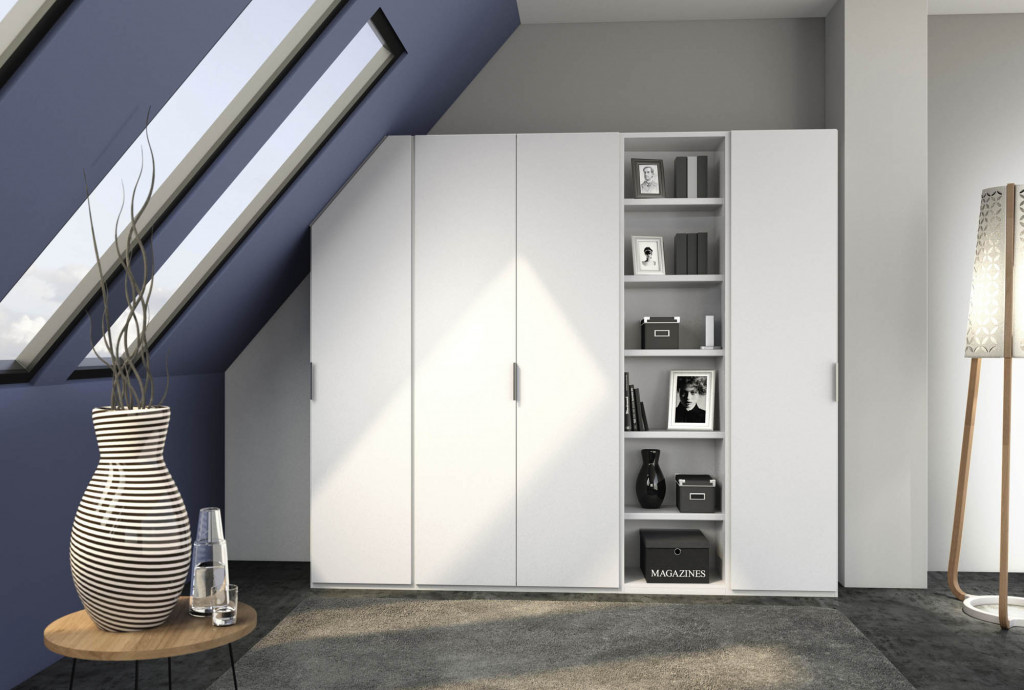 Schwebetürenschrank 5BGG - Korpus Alpinweiß, Front Glas seidengrau glänzend (PG2), Griffleisten chromfarben, 3-türig, BHT ca. 240/223/68 cm
