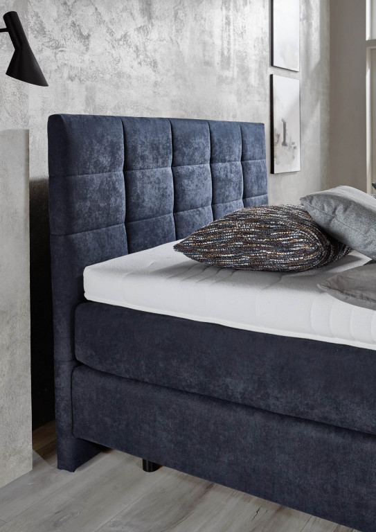 Bezug Enjoy, Farbe Marine, Füße Schwebeoptik, Unterbau Taschenfederkern, 2 x 7-Zonen-Taschenfederkern-Matratze, Härtegrad & Härtegrad 4 Bezug Stoff, geteilt, Topper Gel, Bezug Drell, geteilt, Liegefläche 180 x 200 cm
