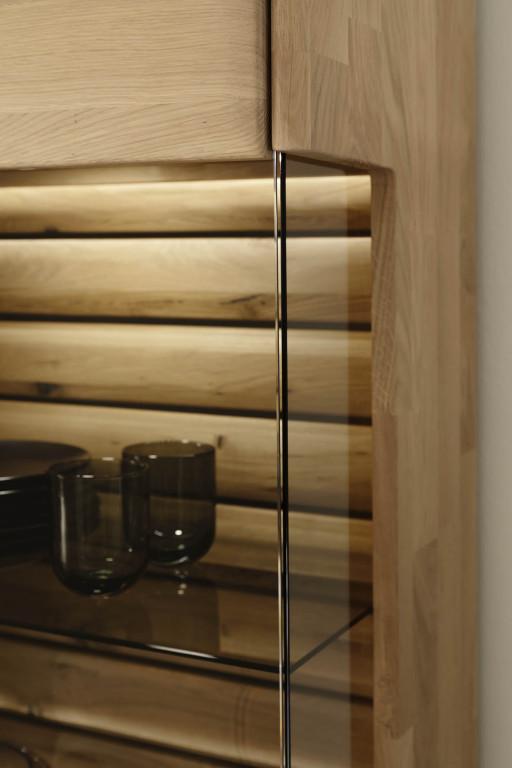 Front Ast/Balkeneiche massiv durchgehende Lamelle in Kristalleiche geölt, Korpus Ast/Balkeneiche massiv keilgezinkt in Kristalleiche geölt, Absetzung Schattenfuge, Parsolglas braun, Griffe Metall anthrazit, Schubkästen und Türen mit Dämpfung, Kombi bestehend aus: