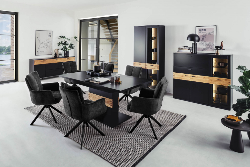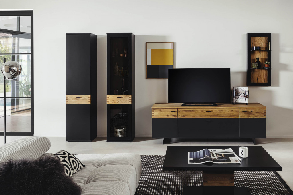 Front schwarzgrau lackiert, Absetzung Wildeiche massiv durchgehende Lamelle, Oberfläche geölt, Frontglas Parsol grau, Korpus schwarzgrau lackiert, Absetzung Wildeiche furniert, Oberfläche geölt, sichtbare Rückwande Risseiche furniert, Oberfläche geölt, Wandregalböden Parsol grau, Griffe Metall schwarzgrau, Metallkufen schwarzgrau, Türen und Schubkästen gedämpft, bestehend aus: