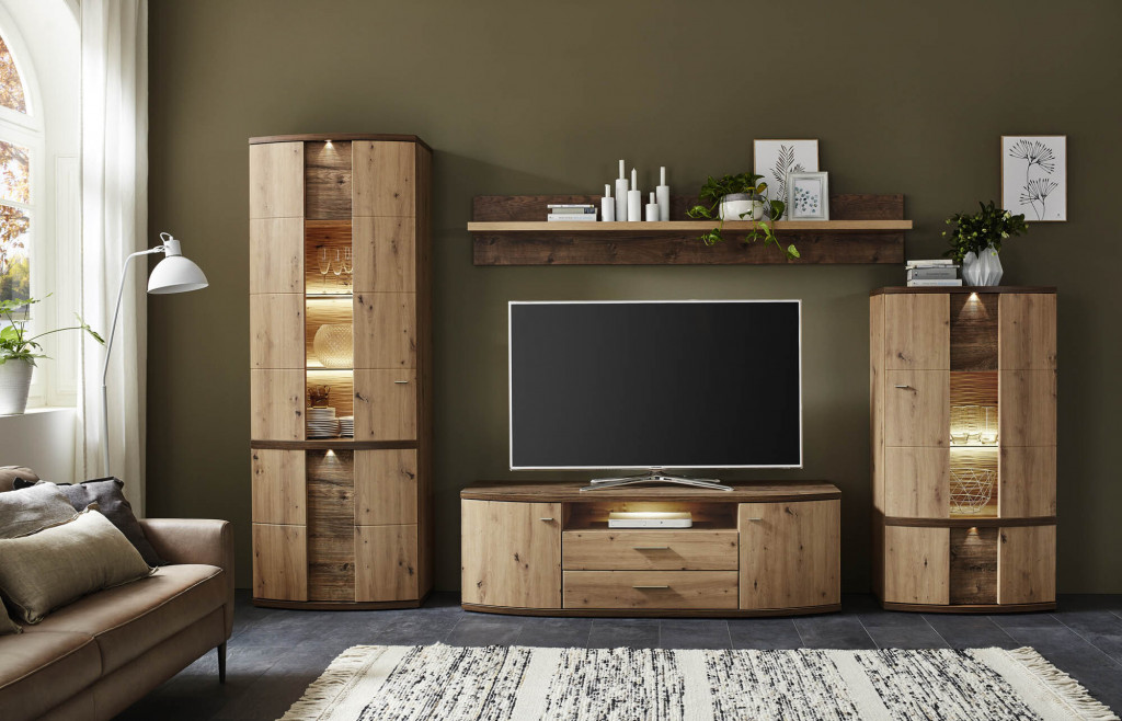 Front Eiche Artisan Folie tiefgezogen, Eiche Ribbeck Cognac Melamin, Absetzung Eiche Ribbeck Cognac Folie geschroppt tiefgezogen, Korpus Eiche Artisan Melamin, Eiche Ribbeck Cognac Melamin, sichtbare Rückwände 3D-Optik Eiche Artisan geschroppt, inklusive Korpusfrontbeleuchtung, Kombi bestehend aus: