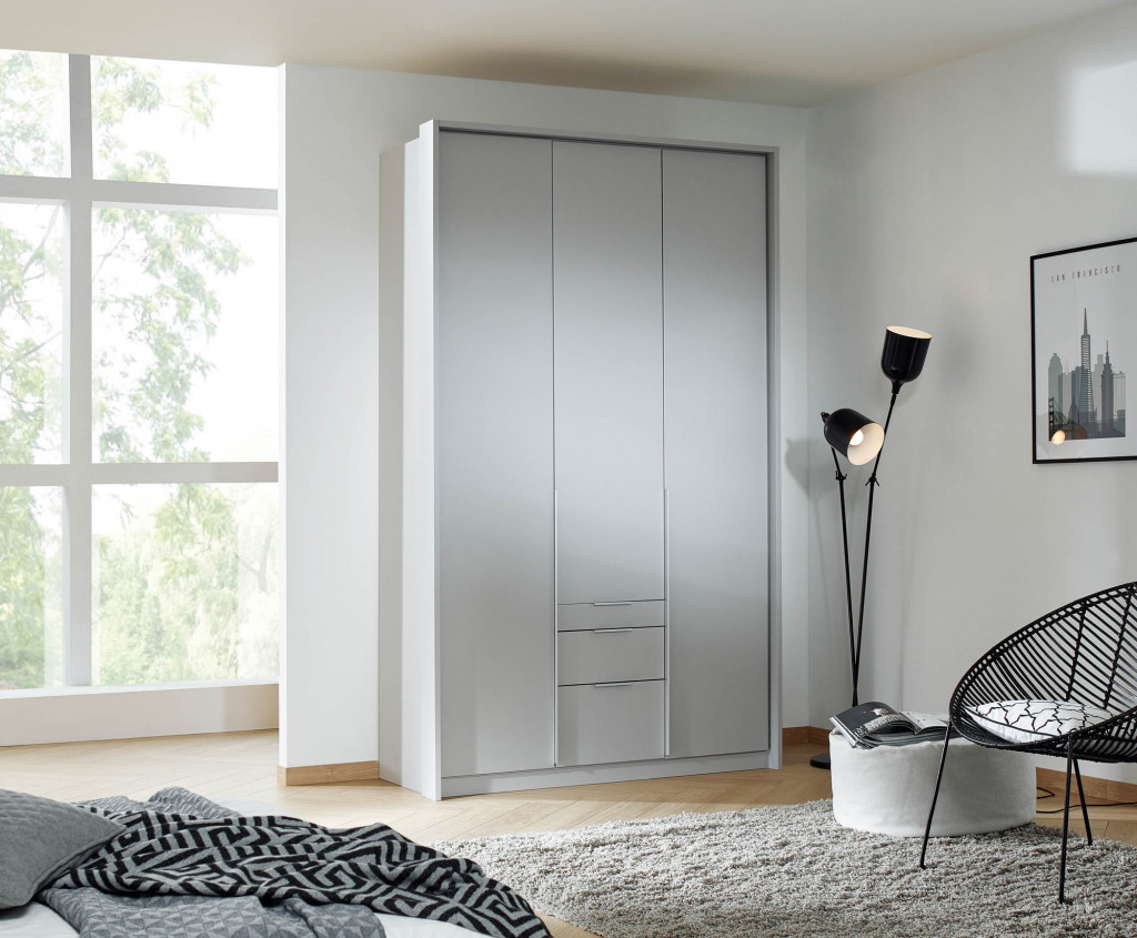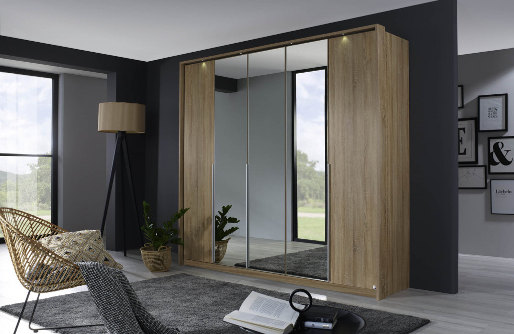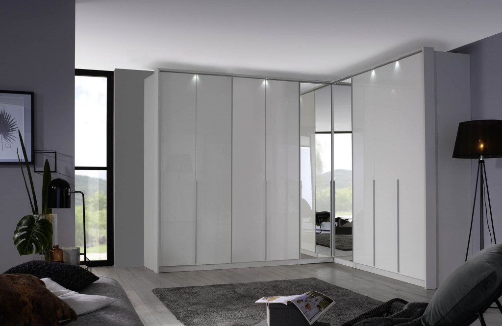 alpinweiss, Griffe alufarbig, 4 Holz- u. 2 Spiegeltüren, inkl. Inneneinteilung: Schubkasteneinsatz und Wäscheeinteilung, BHT ca. 271 x 229 x 54 cm