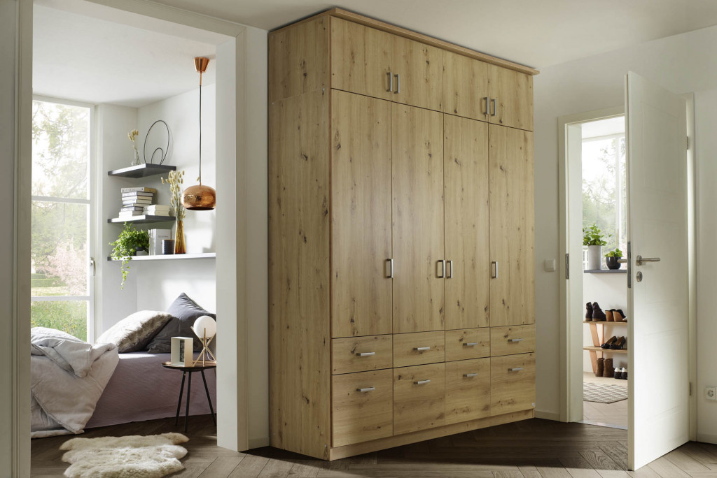 Korpus Dekor-Druck Eiche Artisan, Front grau metallic / Dekor-Druck Eiche Artisan, Innen Texline, Aufleistung Dekor-Druck Eiche Artisan, 3-türig, 1 Spiegeltüre, 6 Schubkästen, mit Oberkranz, BHT ca. 136/199/58 cm, Raster Innen ca. 45/45/45 cm