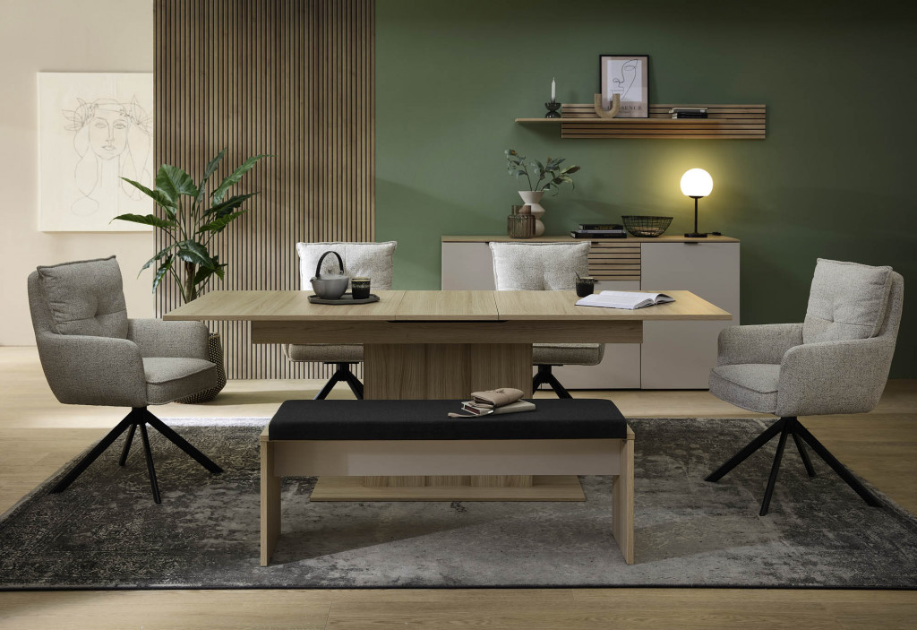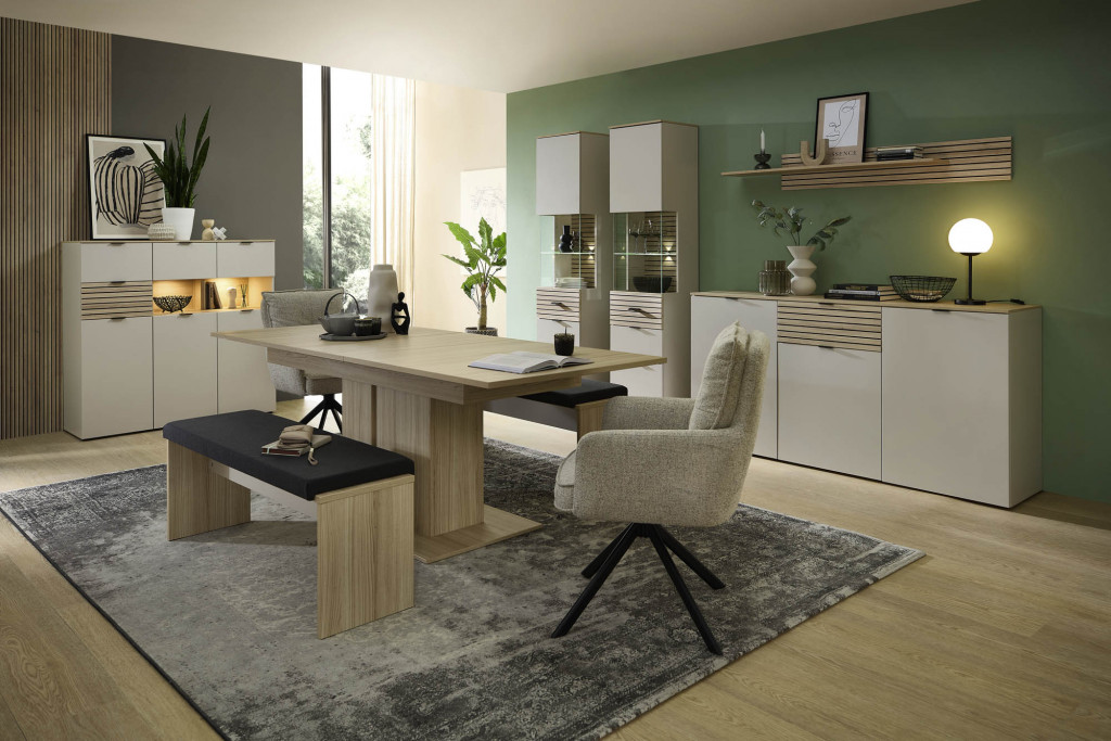 Kaschmir mit Absetzungen in Riva Eiche Nachbildung, oder Schilfgrün supermatt mit Absetzungen in Eiche Artisan Nachbildung, inkl. LED-Beleuchtung, mit Softclose und Selbsteinzug