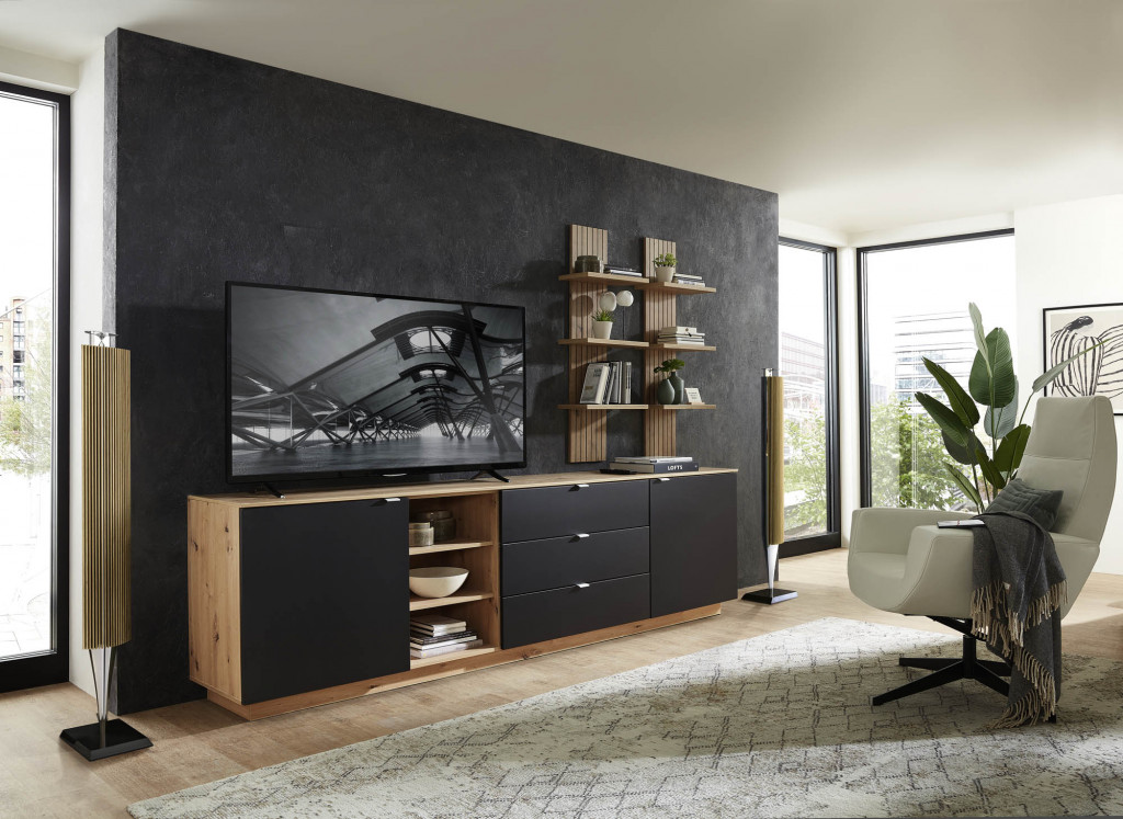 Eiche Artisan Nachbildung und schilf supermatt, Metallgriffe silber matt, mit Softclose und Selbsteinzug, inkl. LED-Beleuchtung,bestehend aus Lowboard, mit 2 Türen und 3 Schüben, BHT ca. 240 x 77 x 44 cm und 2 Wandpaneelen mit je 3 Böden, BHT ca. 38 x 120 x 22 cm
